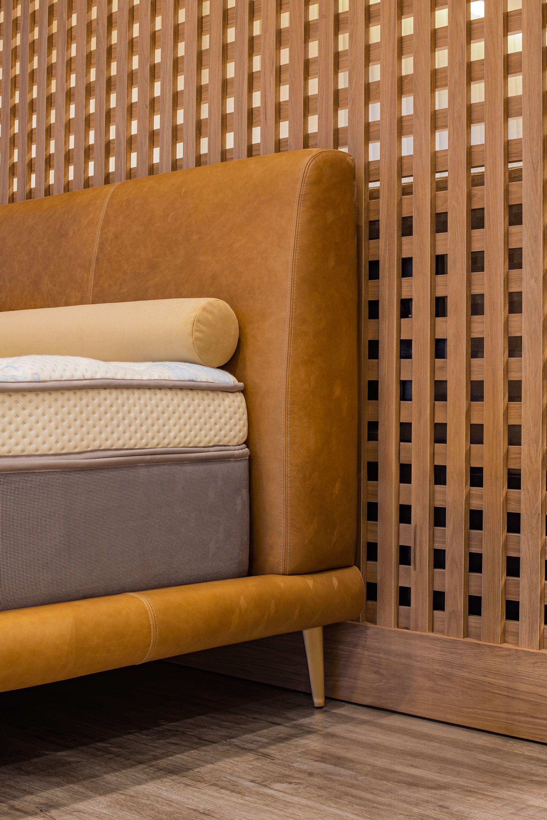 Trazendo a opção de revestimentos em tecido ou couro natural, a cama permite personalização para se adequar ao gosto mais refinado. Os pés, disponíveis em tons metalizados como prata, pérola, cobre, dourado ou preto fosco, são um dos detalhes que marcam o design dessa cama, que parece flutuar sobre a composição do ambiente.