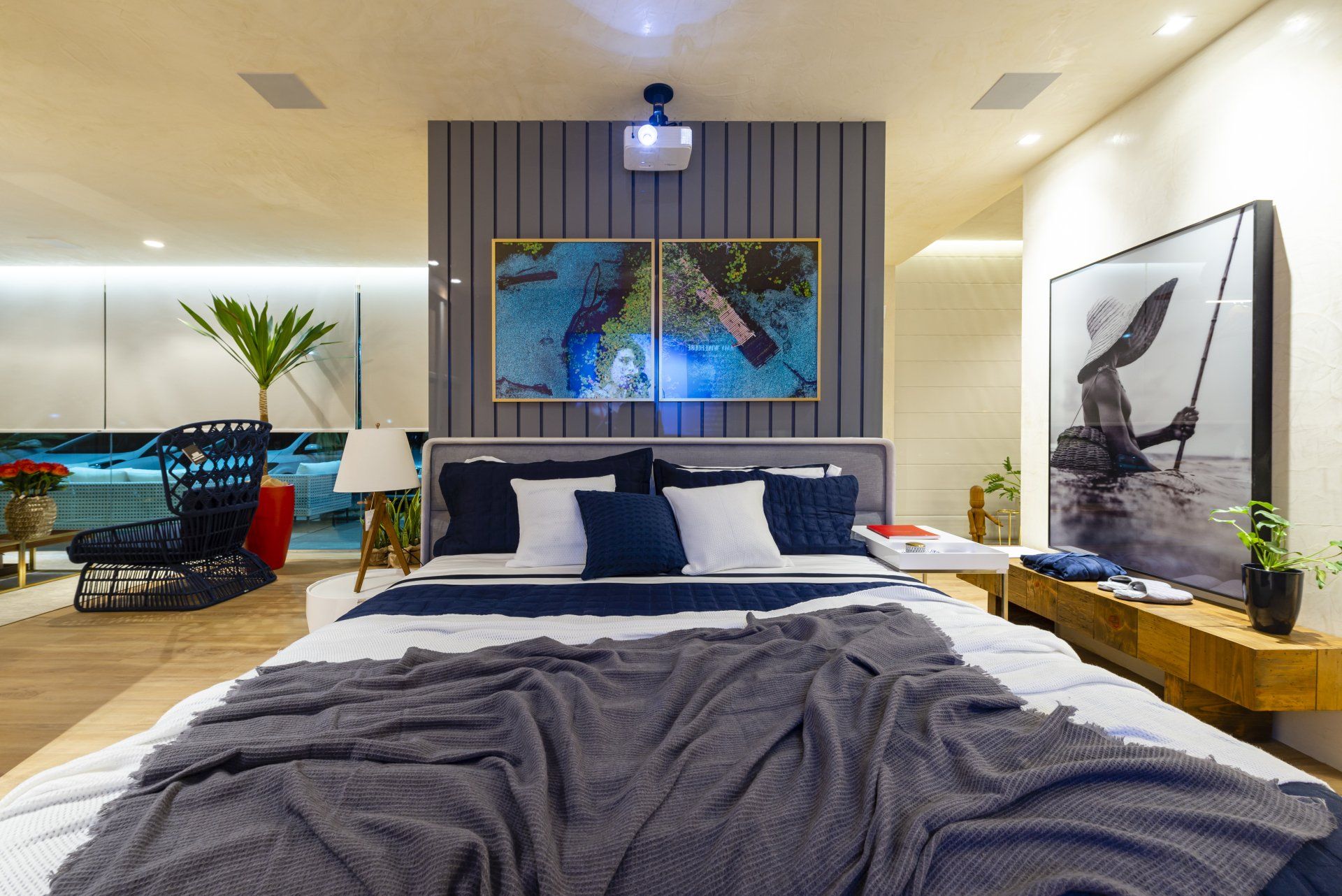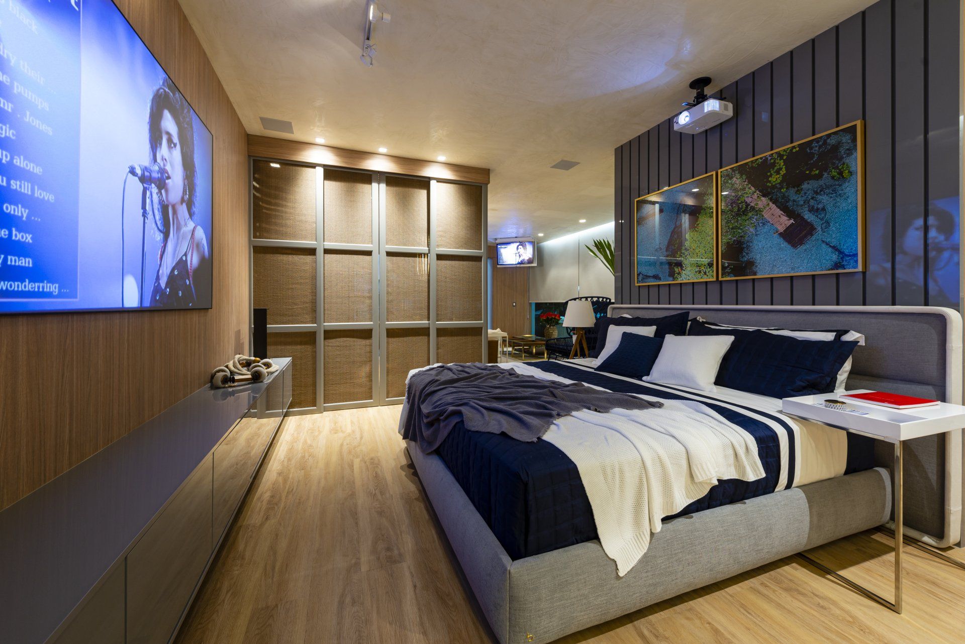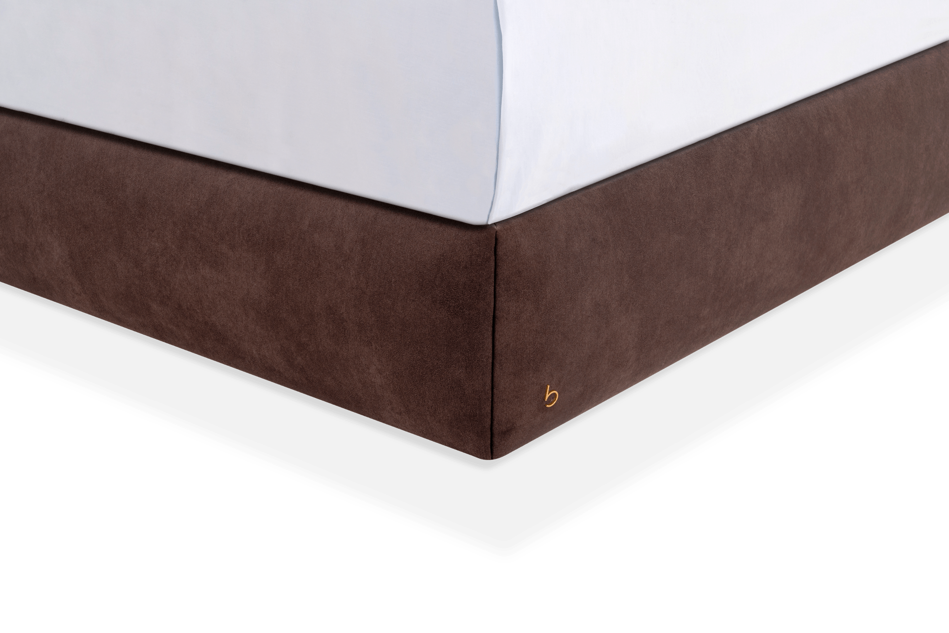 A elegância desta cama é percebida em suas linhas horizontais bem pronunciadas, que ficam dentro de uma moldura revestida em tecido ou couro natural.