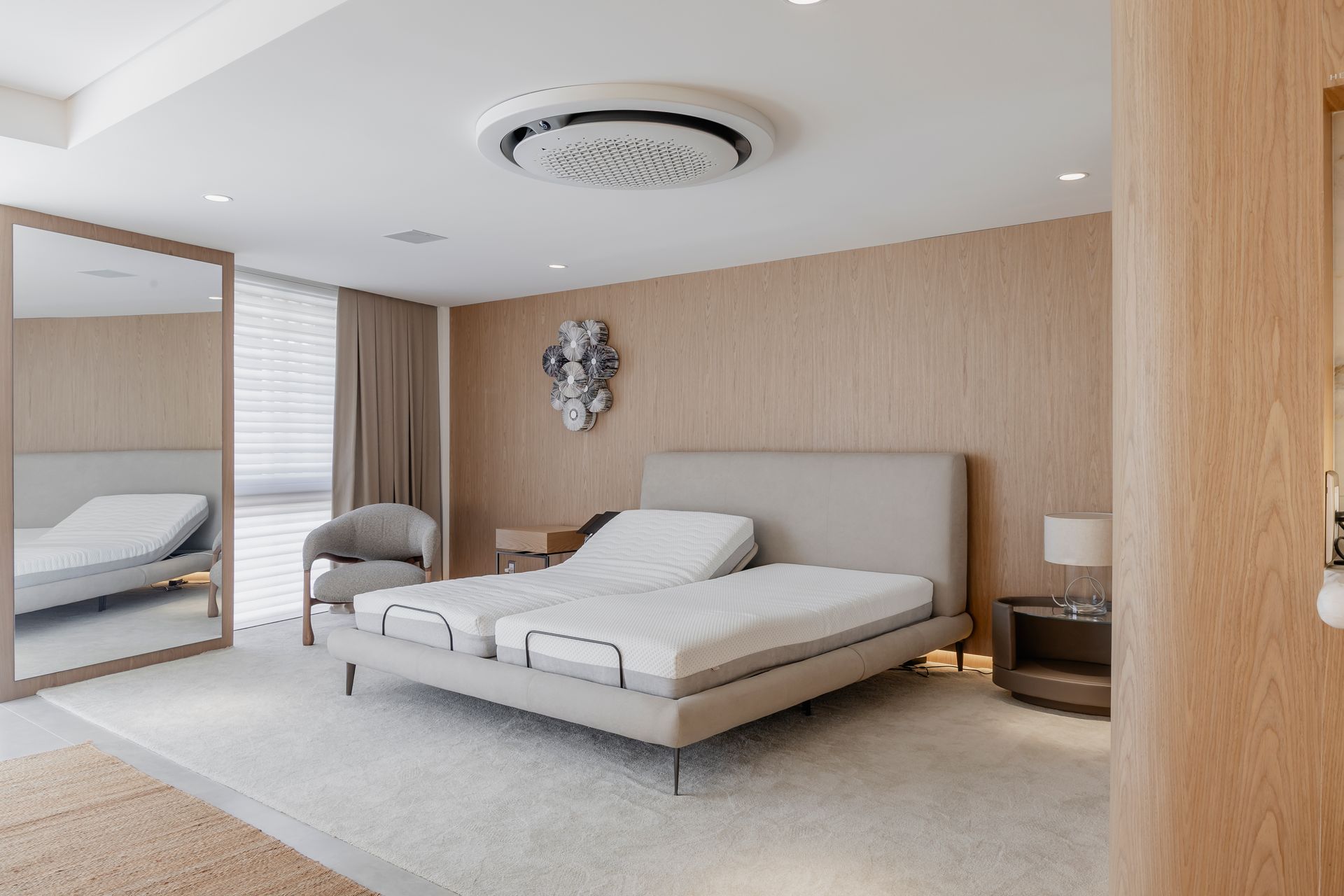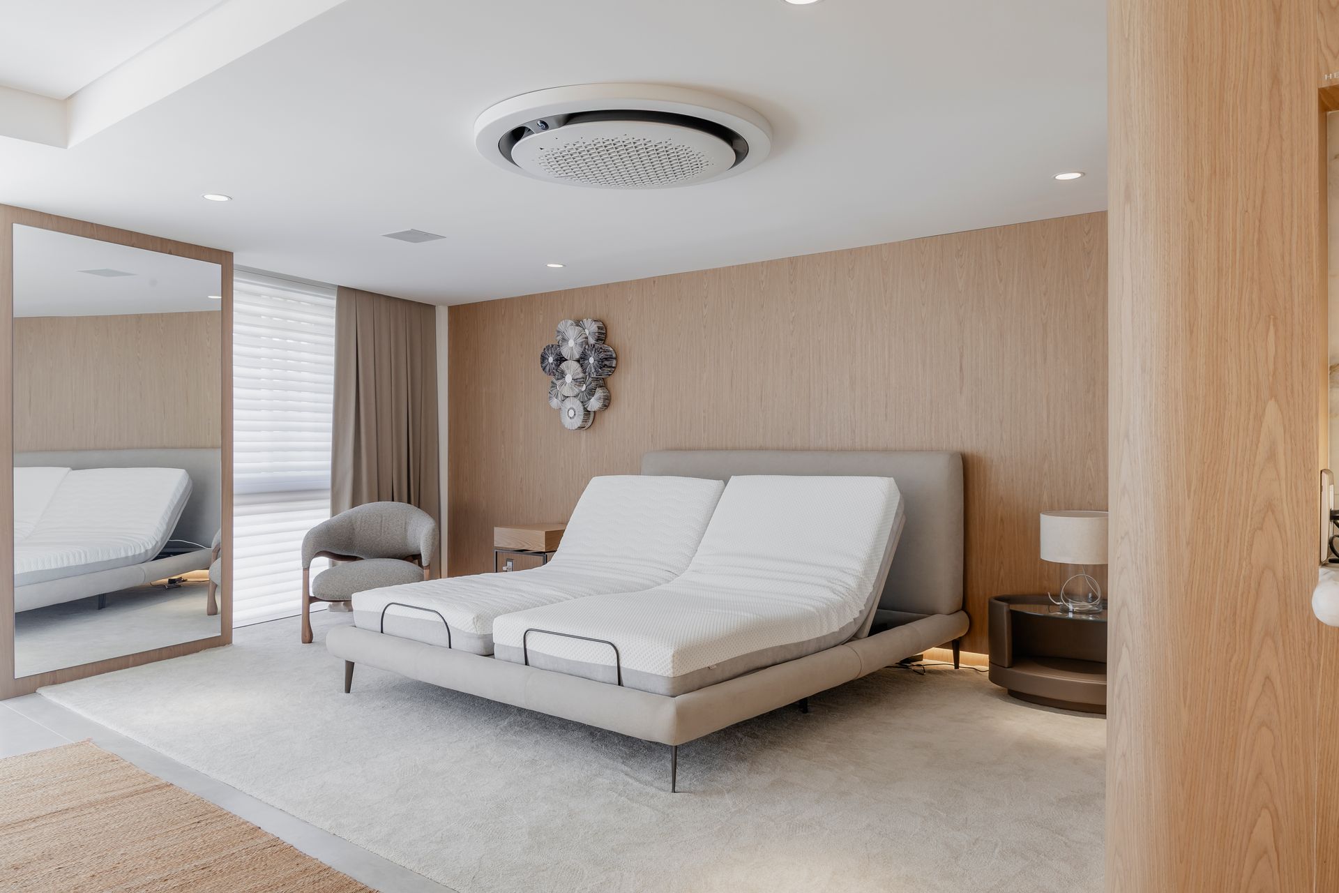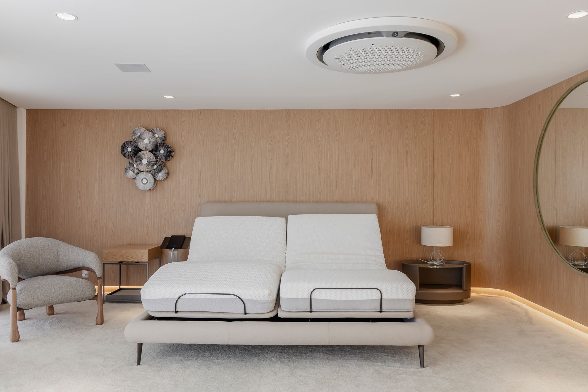A base articulada combina design contemporâneo e tecnologia para transformar o descanso em experiência.