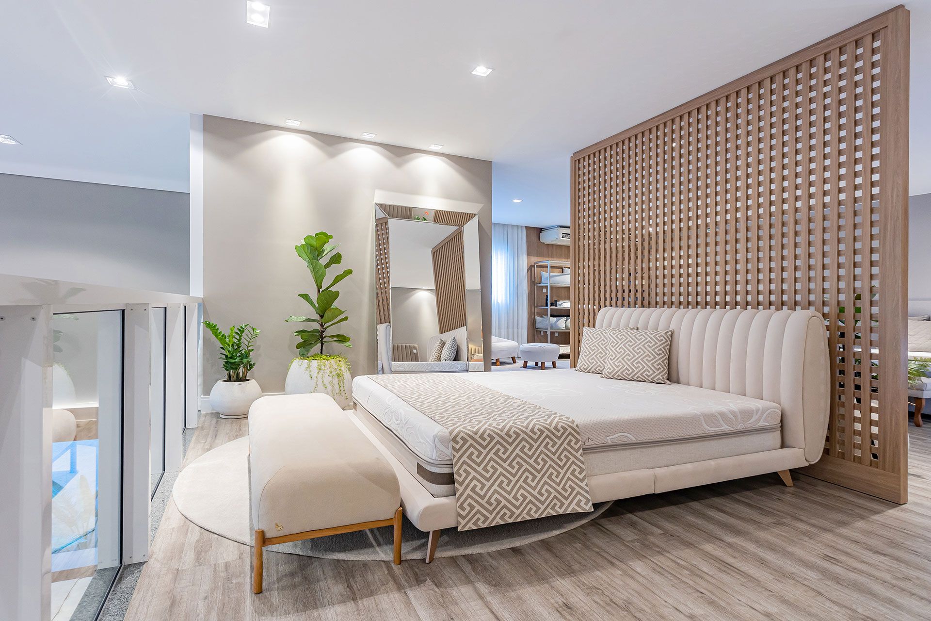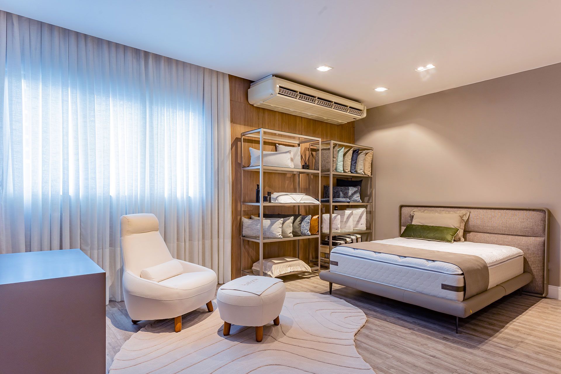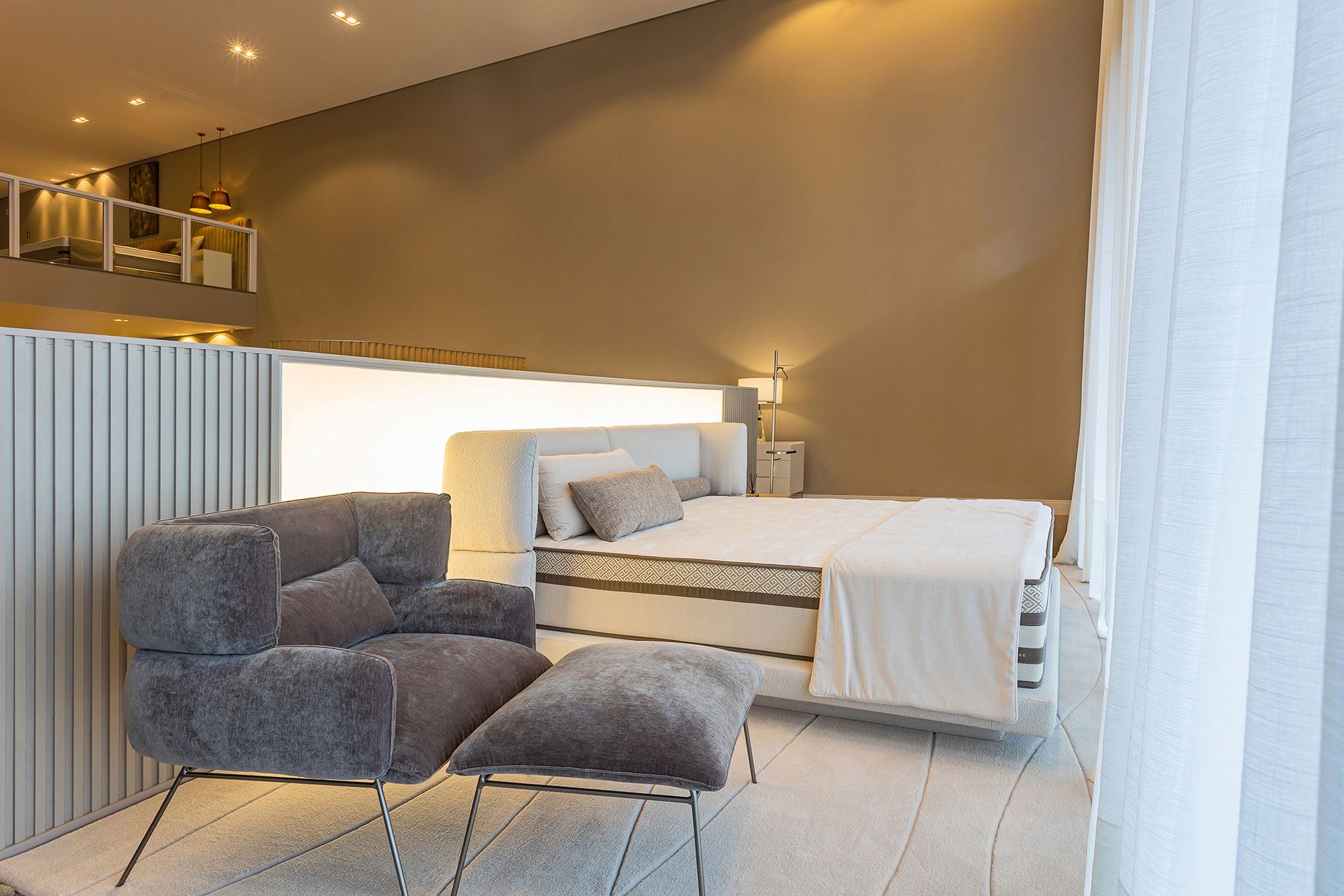 os clientes encontrarão não apenas colchões, mas também uma variedade de produtos para o quarto, incluindo camas com design exclusivo, camas-base, cabeceiras, travesseiros, roupas de cama e essências exclusivas. Além disso, a loja oferece móveis como mesas de cabeceira, escrivaninhas e cabideiros, todos projetados para criar dormitórios sofisticados e confortáveis.