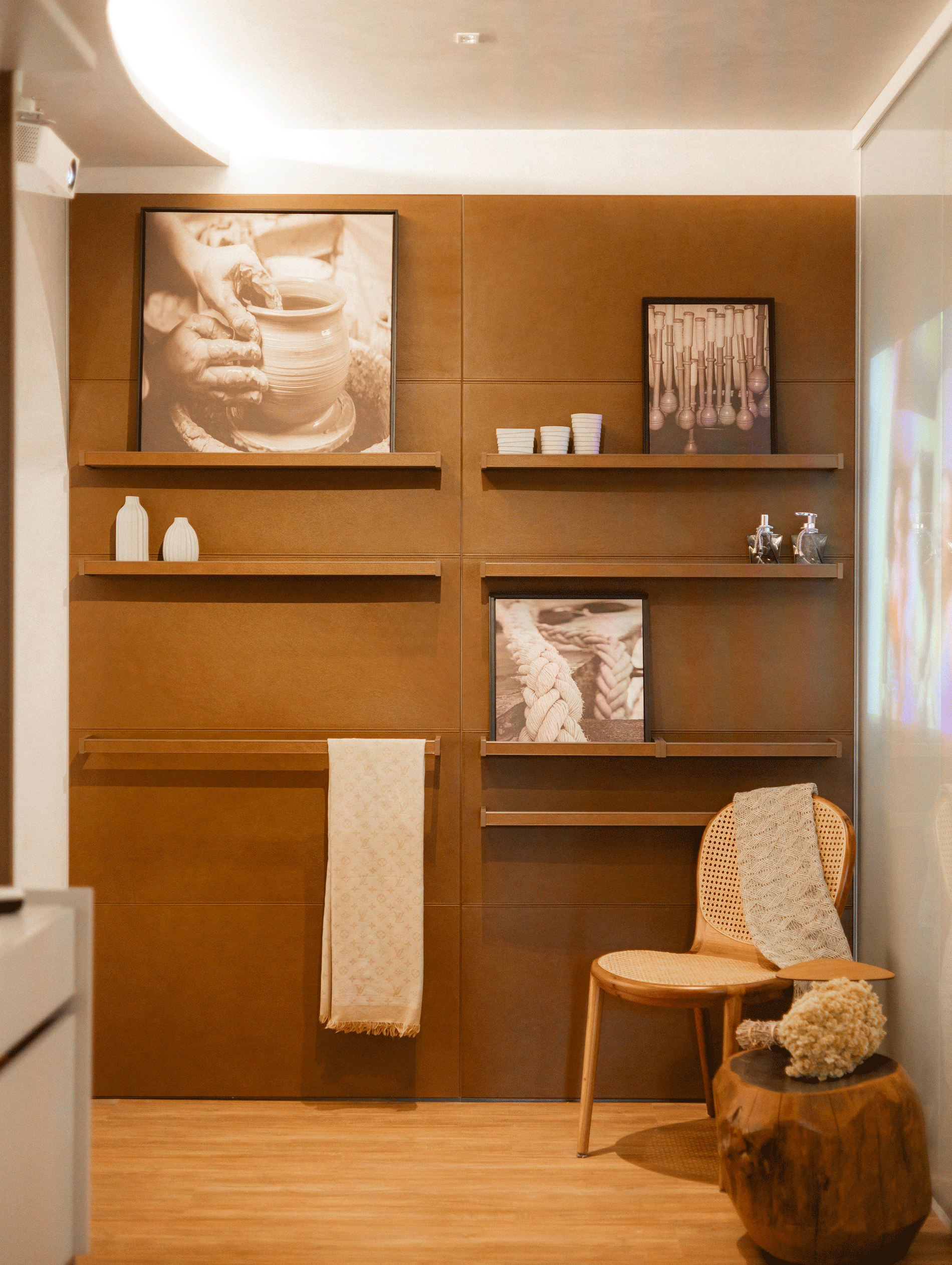 A madeira é o elemento que une as diversas influências do projeto. Ela evoca a sensação de aconchego