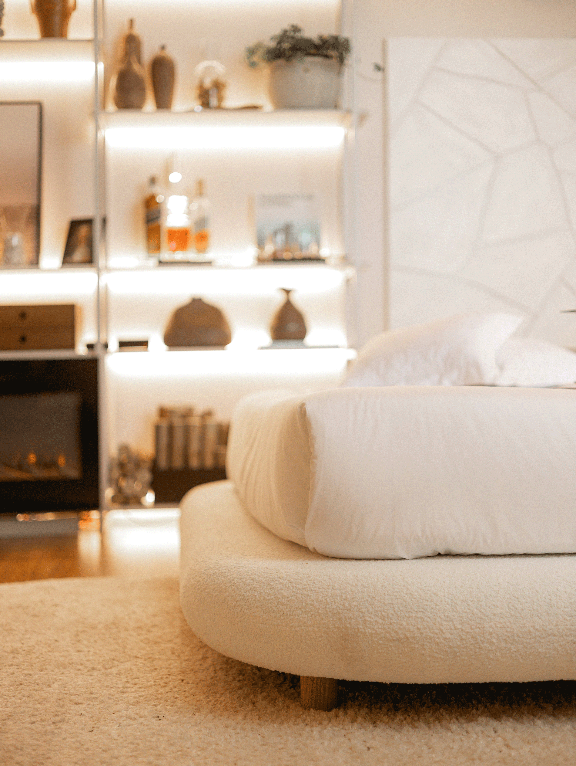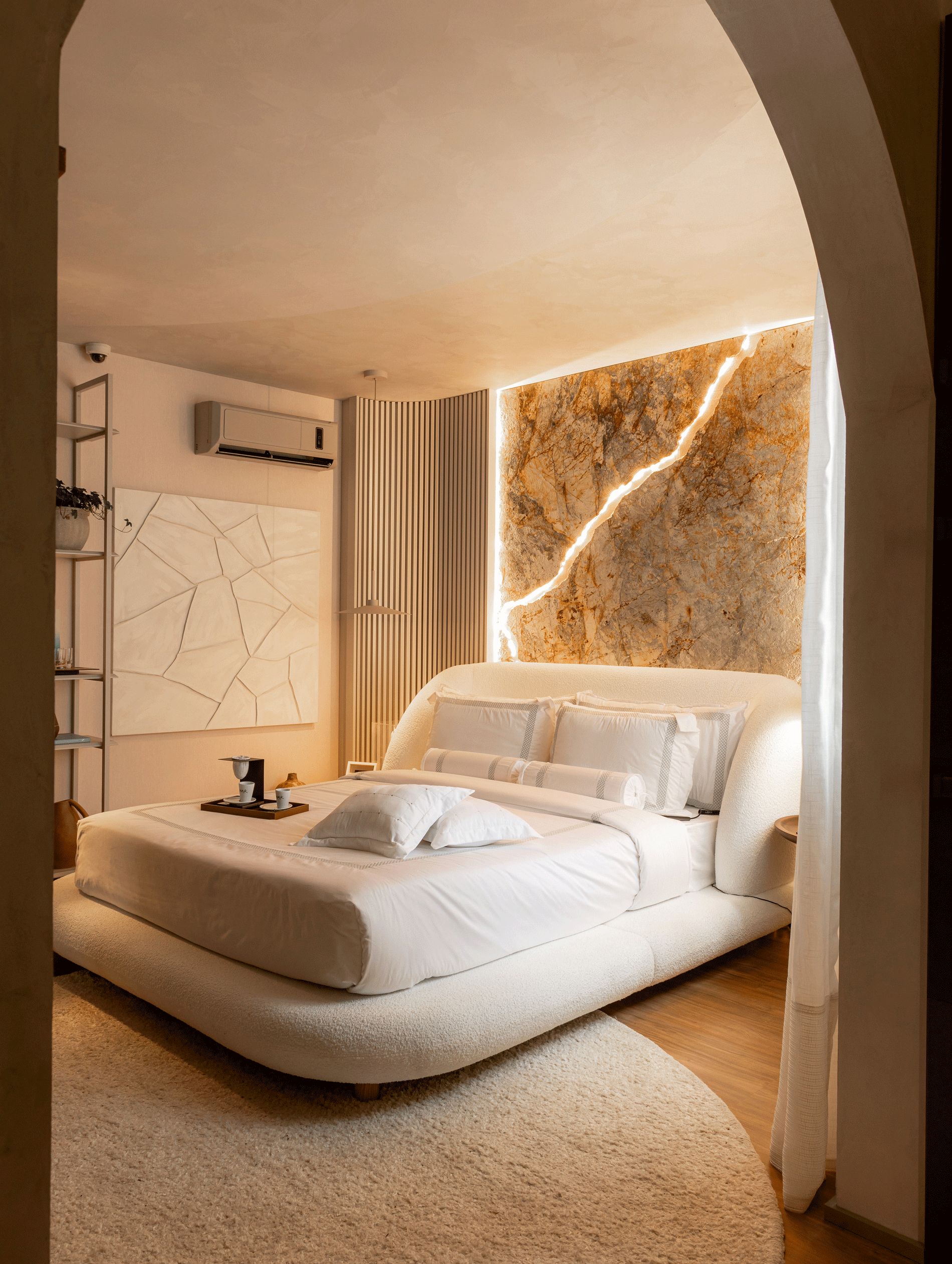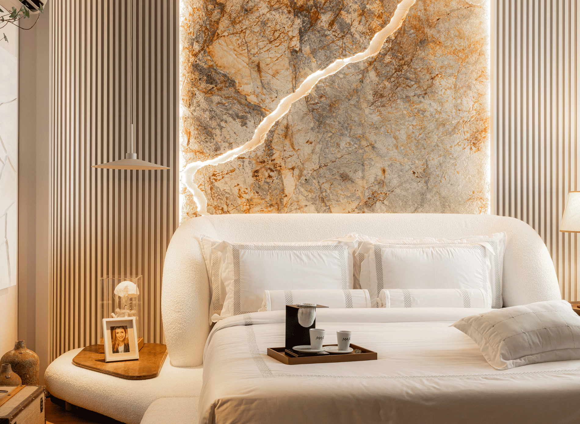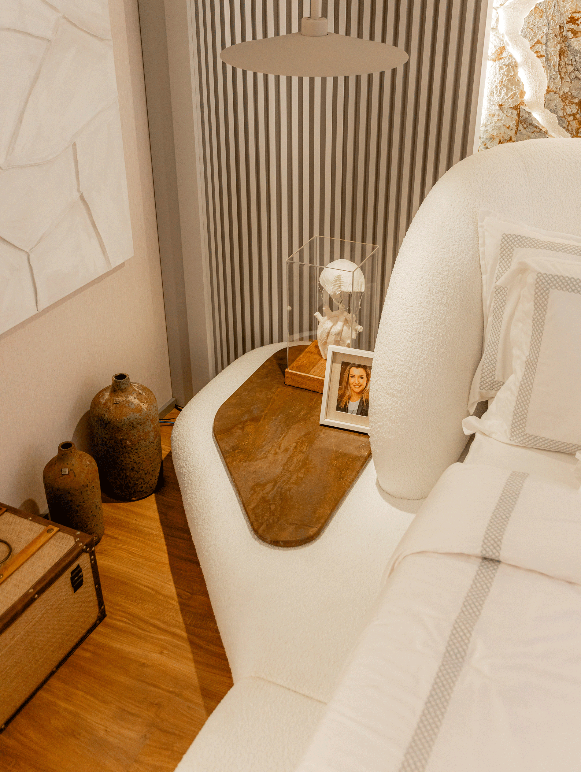 Cama Oslo, assinada pela Designer Larissa Diegoli, uma peça orgânica que carrega formas únicas, se tornando a protagonista do ambiente de dormir. A arte também tem seu lugar, com duas telas assinadas pelo artista plástico e designer de produto Julian Gallasch.