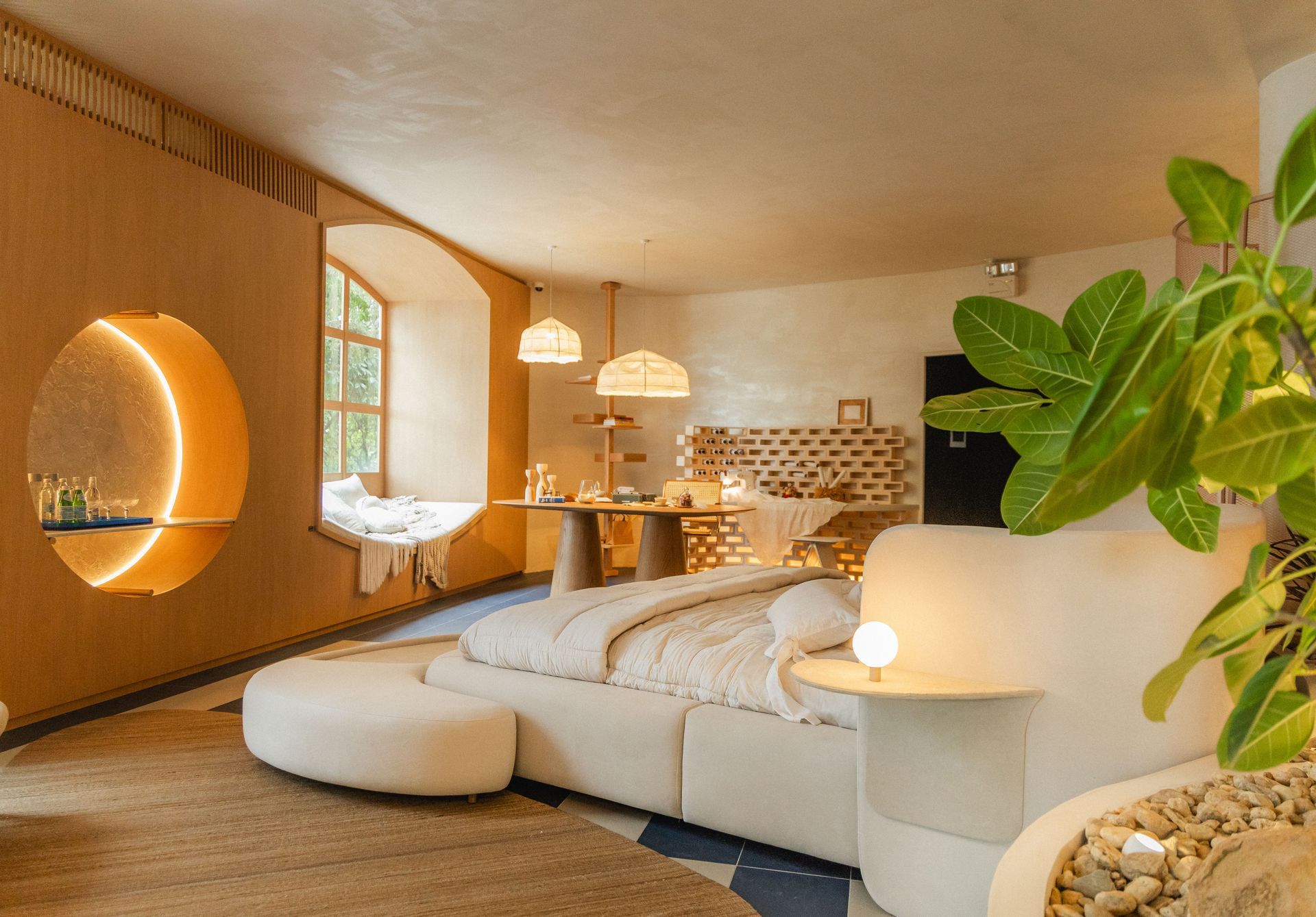 A iluminação, por exemplo, influencia diretamente o ritmo do corpo. Luzes indiretas e bem posicionadas reduzem contrastes e ajudam a criar uma atmosfera mais serena, enquanto volumes estofados e superfícies macias contribuem para a sensação de acolhimento visual e tátil. O desenho envolvente do mobiliário, especialmente da cama e da cabeceira, cria limites suaves, que protegem e convidam ao descanso profundo.