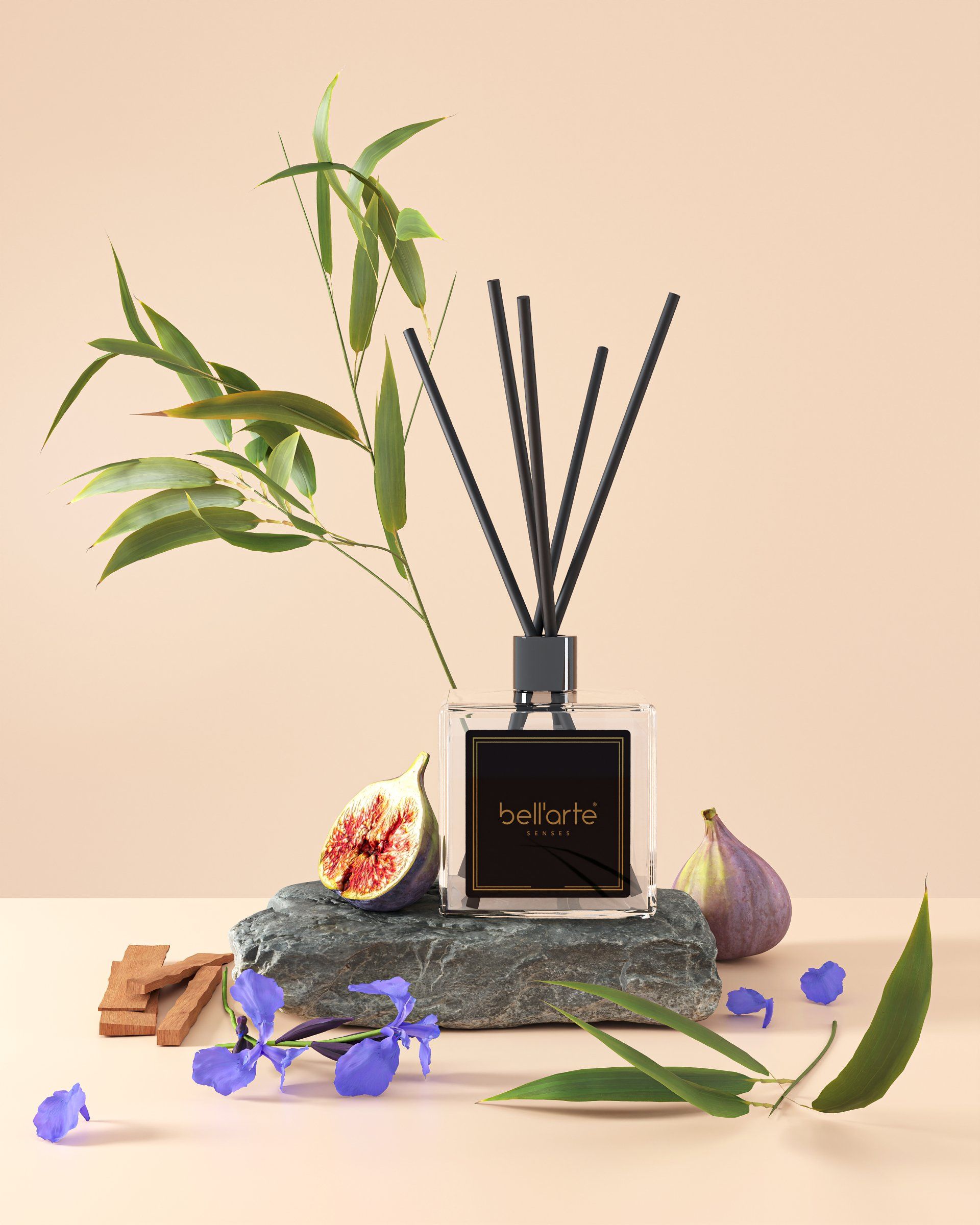 Formulado com fragrâncias de alta qualidade que aumentam percepção de fixação do aroma no ambiente e óleos essenciais naturais de Figo e Flor de Íris, a essência exclusiva do Aromatizador da Bell’Arte é fortemente aromática e exala acordes amadeirados envolvidos pelo frescor de notas de folhas de bambu.