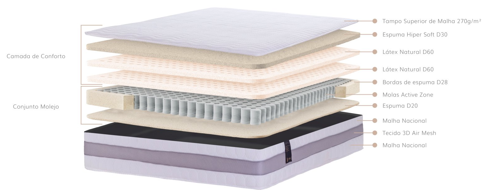 Sleeping on a double layer of natural latex, cradled by the soft bounce of mini pocket springs that gently hug every curve of the body, is a unique experience. The feeling of comfort and involvement of the Flexy Prime is complemented by the padded top made of technological mesh and 3D fabric on the sides, which facilitate internal ventilation and keep the mattress temperature always pleasant. In addition to being comfortable, the model is highly durable and suitable for articulated beds.
