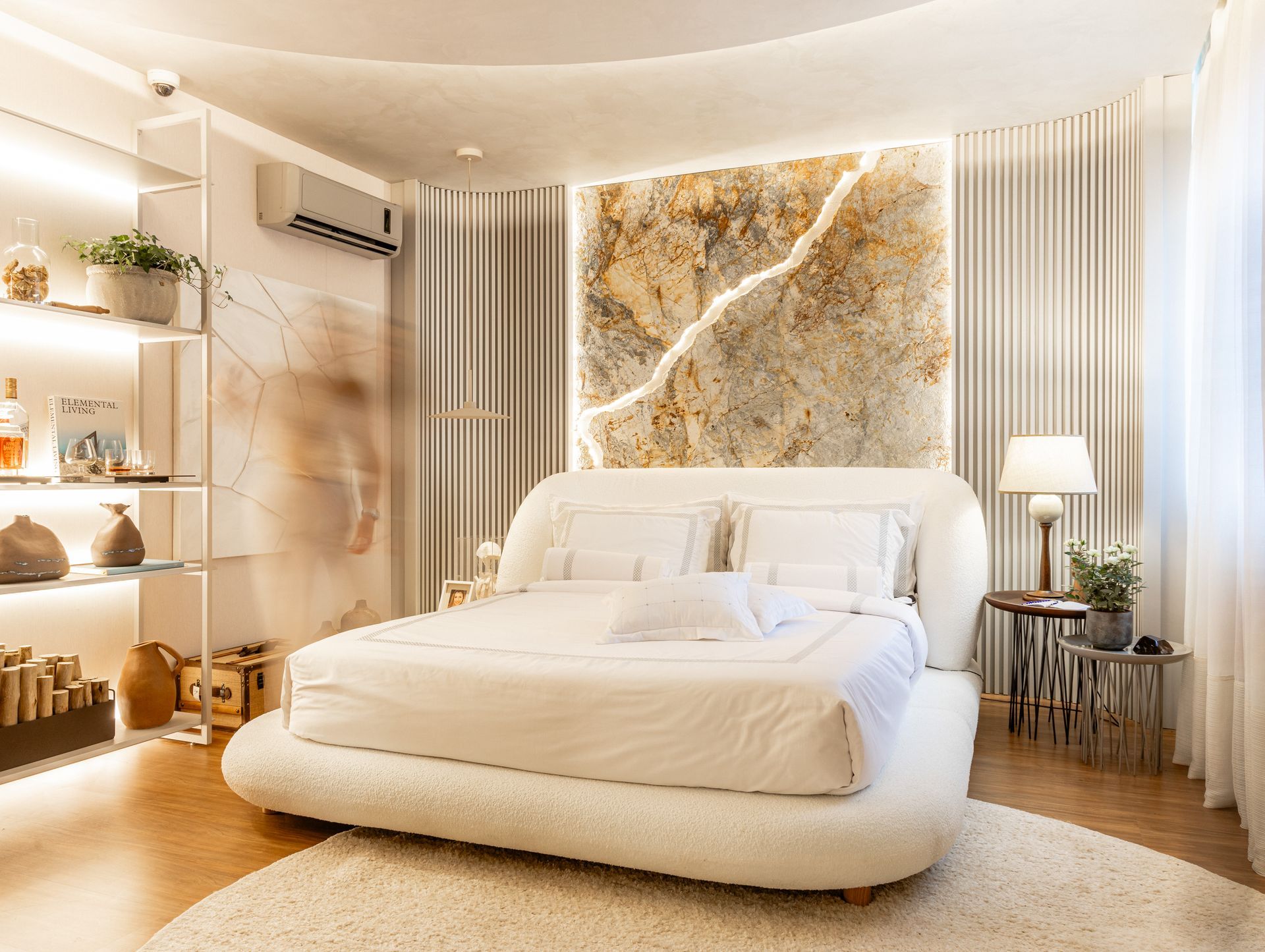 cocooning. Essa abordagem reforça o quarto como espaço de refúgio, respondendo a uma busca crescente por ambientes que desaceleram e acolhem. Mais do que tendência estética, trata-se de uma leitura sensível do modo como as pessoas desejam descansar hoje.