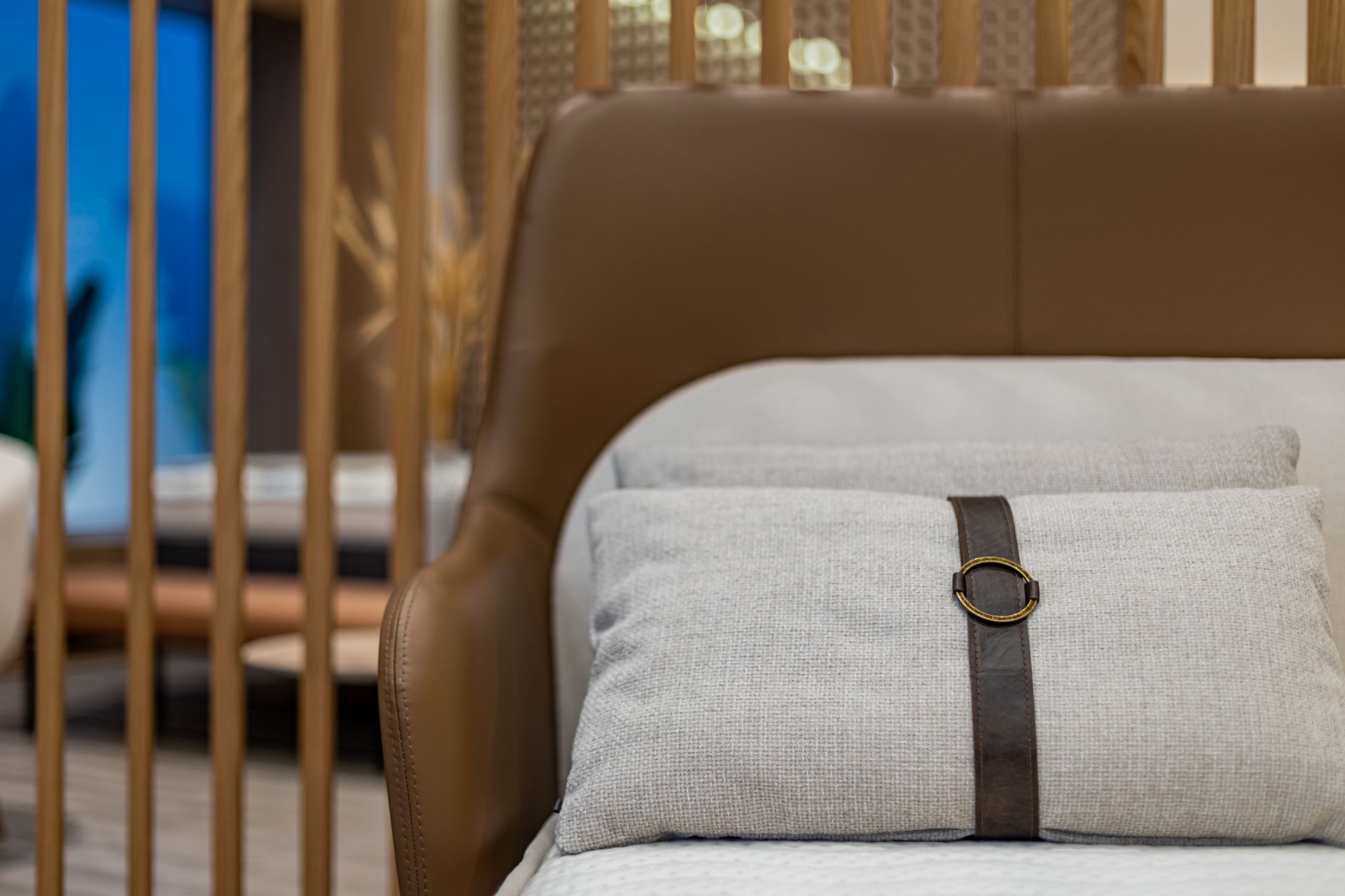 O design envolvente da cabeceira é capaz de transformar a cama em um gesto de acolhimento, criando um limite suave entre o corpo e o mundo exterior e reforçando a sensação de bem-estar.
