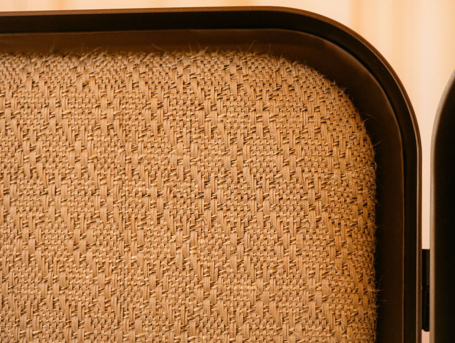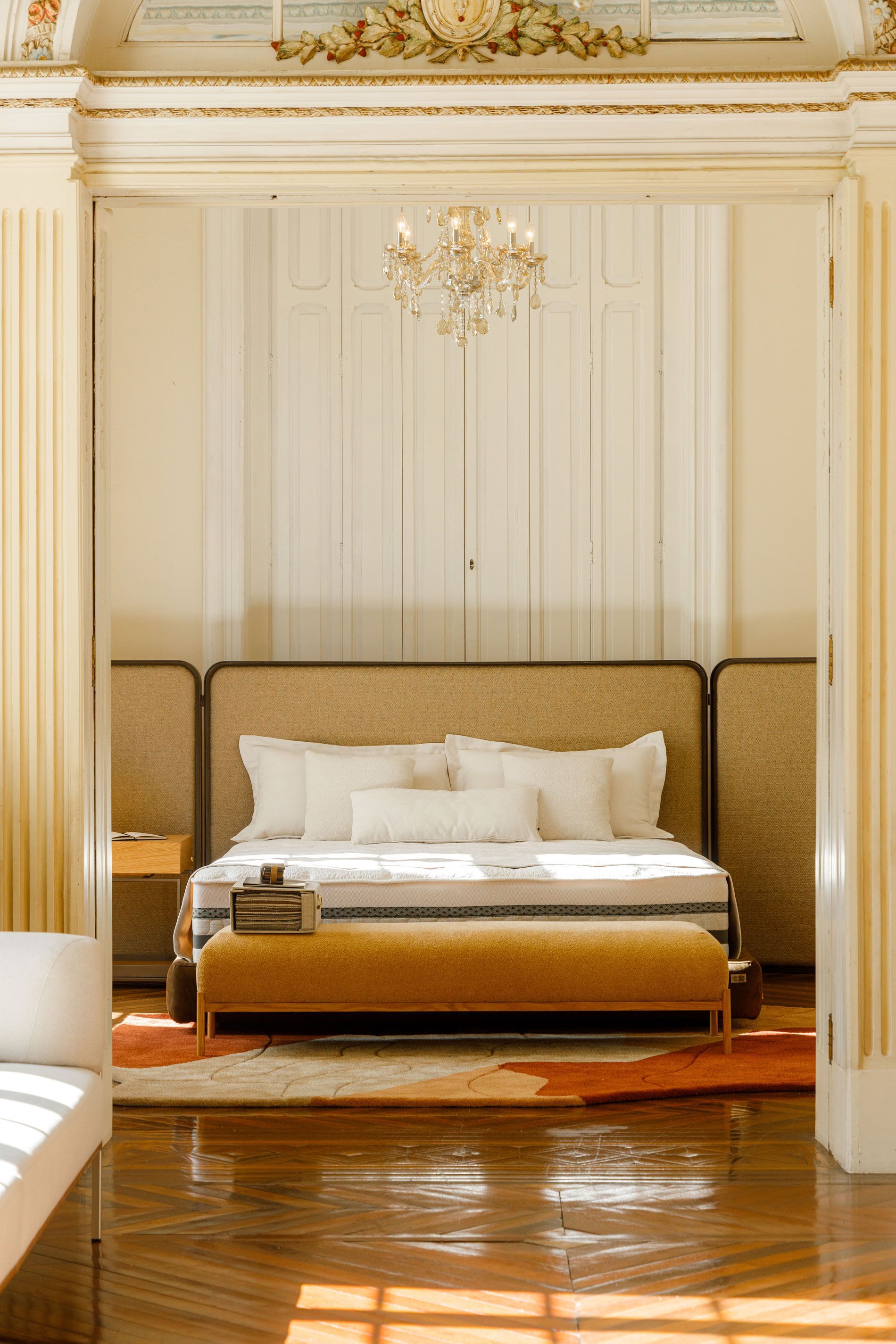 A ideia foi trazer o elemento biombo, usado normalmente para dividir ambientes, como um acabamento atrás da cama e das mesas de cabeceira e que fizesse a integração de tudo. A cama Pantalla exibe uma palha natural de tramado único e sofisticado. Realçada por uma moldura em aço, ela se diferencia no cenário por sua simplicidade, além de trazer uma atmosfera natural e acolhedora de conexão com a natureza.