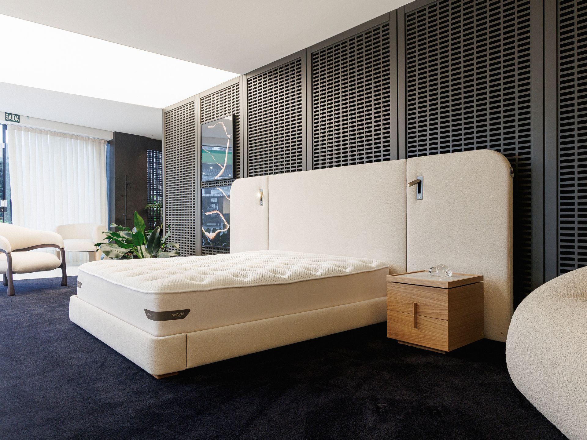 Na Cama Lua, o estofamento contínuo e o desenho envolvente transformam o quarto em um espaço de acolhimento, pensado para desacelerar e recuperar o corpo e a mente.