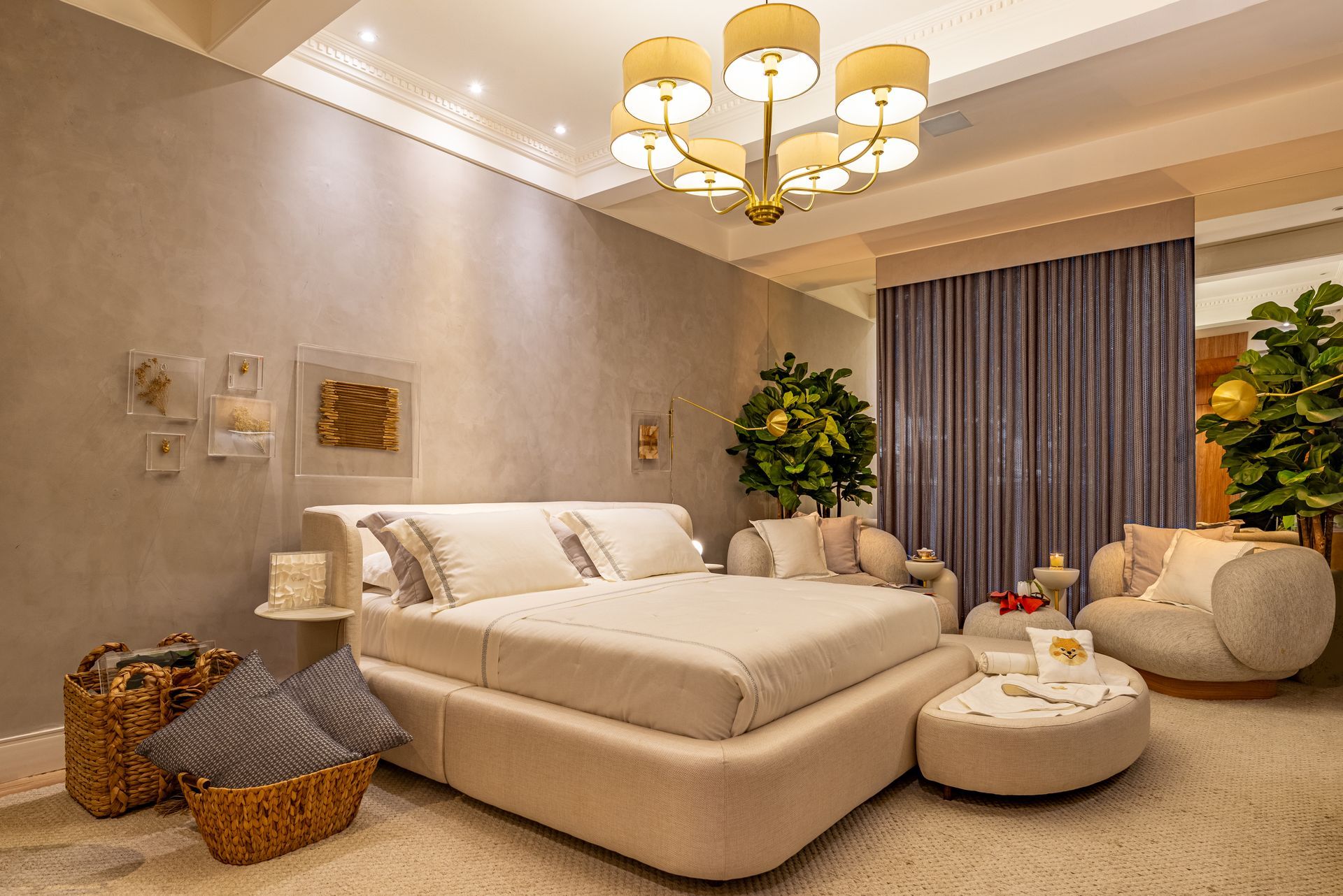 No dormitório, essa mudança se manifesta de forma delicada e intencional. Tecidos táteis, volumes mais envolventes, cabeceiras generosas, cortinas com maior presença e uma iluminação cuidadosamente dosada passam a compor ambientes pensados para desacelerar. Cada escolha deixa de ser apenas estética e passa a contribuir ativamente para o repouso físico e emocional.