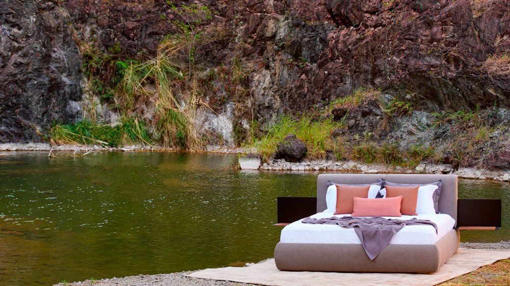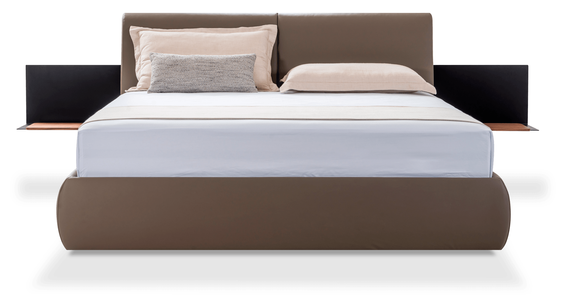 Mesas de cabeceira em aço carbono com recortes a laser, que parecem brotar da cabeceira estofada, dão um toque especial à cama, que ainda tem a opção inovadora e prática de incluir carregadores por indução na cabeceira.